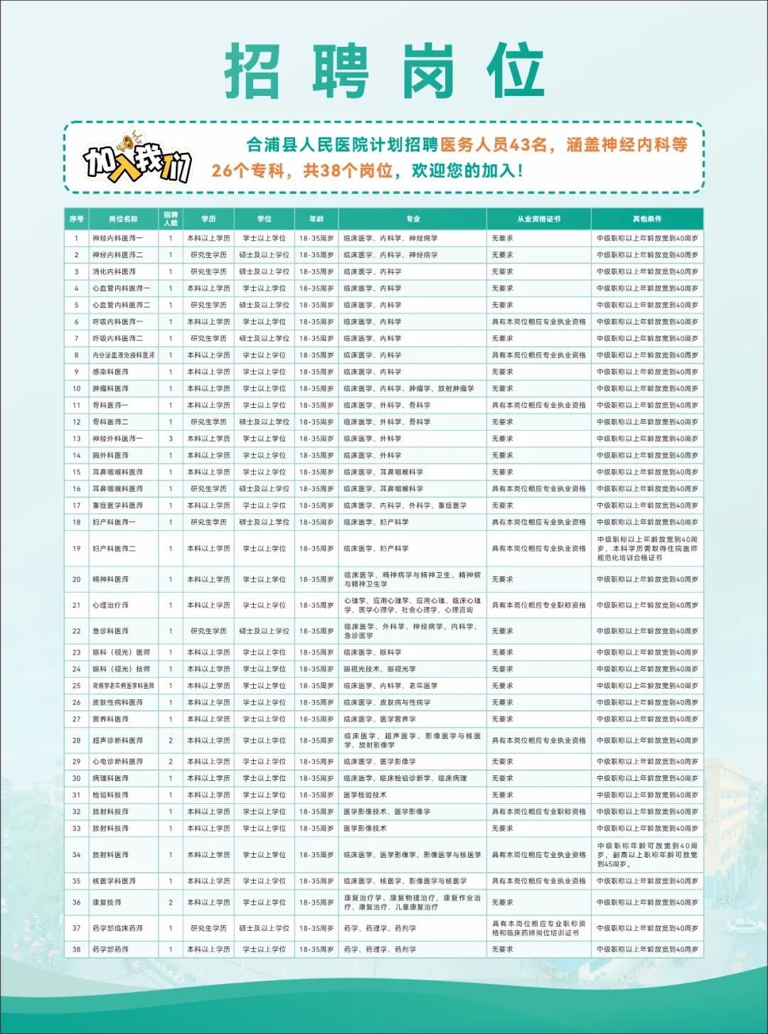 信息發布: 招聘過程中的重要通知將在微信公眾號“廣西合浦縣人民醫院”“合浦縣人民醫院”及醫院官網發布,請應聘人員密切關注。