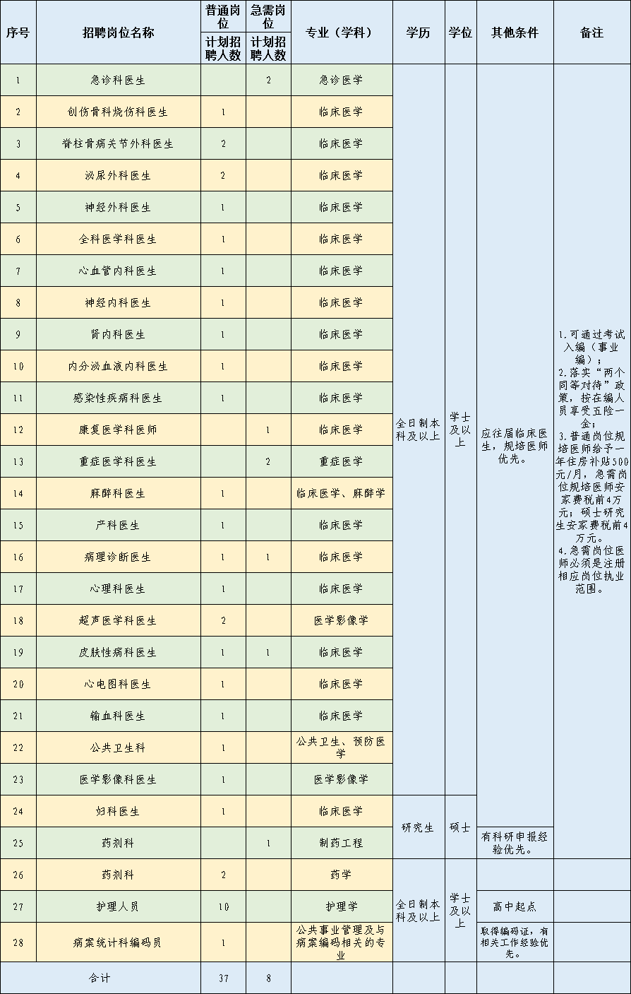 2.具有規培合格證的醫生依照國衛辦科教發〔2021〕18號文件,落實“兩個同等對待”政策,即“面向社會招收的普通高校應屆畢業生培訓對象培訓合格當年在醫療衛生機構就業的,在招聘、派遣、落戶等方面,按當年應屆畢業生同等對待。對經住培合格的本科學歷臨床醫師,在人員招聘、職稱晉升、崗位聘用、薪酬待遇等方面,與臨床醫學、中醫專業學位碩士研究生同等對待”。普通崗位規培醫師給予一年住房補貼500元/月,急需崗位規培醫師安家費稅前4萬元,急需崗位醫師必須注冊相應崗位執業范圍。