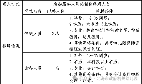 為滿足幼兒園后勤服務(wù)用人的需要,擬向社會公開招聘后勤服務(wù)人員控制數(shù)工作人員3名。