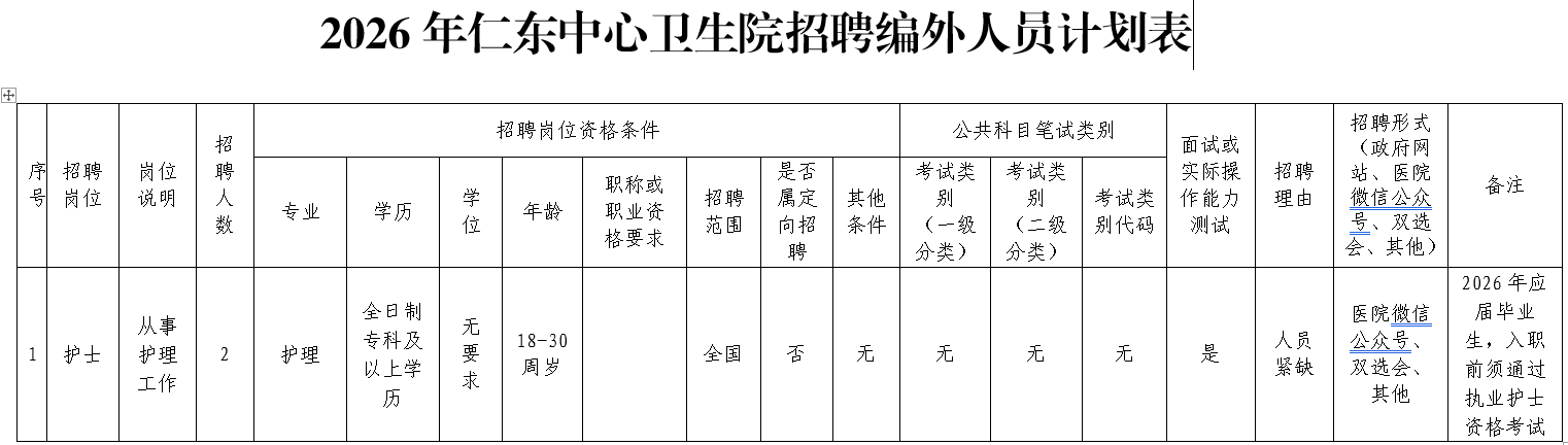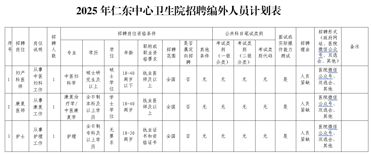 7.學歷、專業及其他任職要求詳見仁東中心衛生院招聘編外人員計劃表。