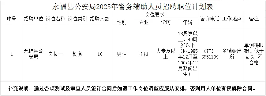 計劃招聘警務輔助人員10名。具體崗位、招聘人數、資格條件詳見《永福縣公安局輔警招聘計劃表》。