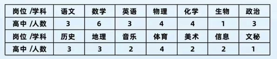 學校于2023年9月1日正式開學,現有30個行政班,一千余名學生,專任教師128人,發展勢頭強勁。為適應學校未來發展需要,特面向全國師范類畢業生擇優招聘青年教師若干,詳情如下: