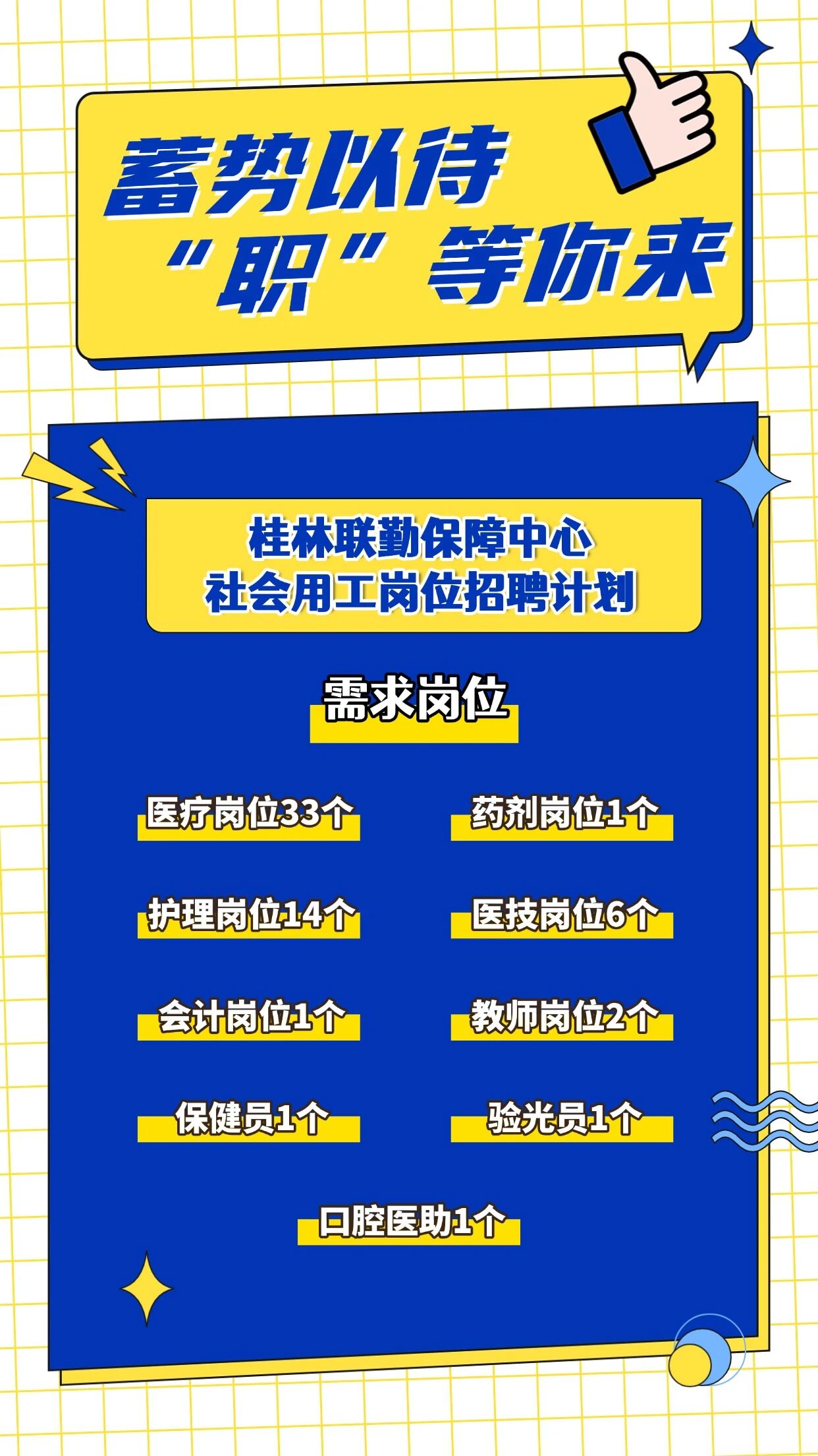 此次發(fā)布桂林聯(lián)勤保障中心社會用工崗位招聘計劃60個,其中:專業(yè)技術(shù)崗位58個(醫(yī)療33個、藥劑1個、護理14個、醫(yī)技6個、會計1個、教師2個、保健員1個)、工勤技能崗位2個(驗光員1個、口腔醫(yī)助1個)。