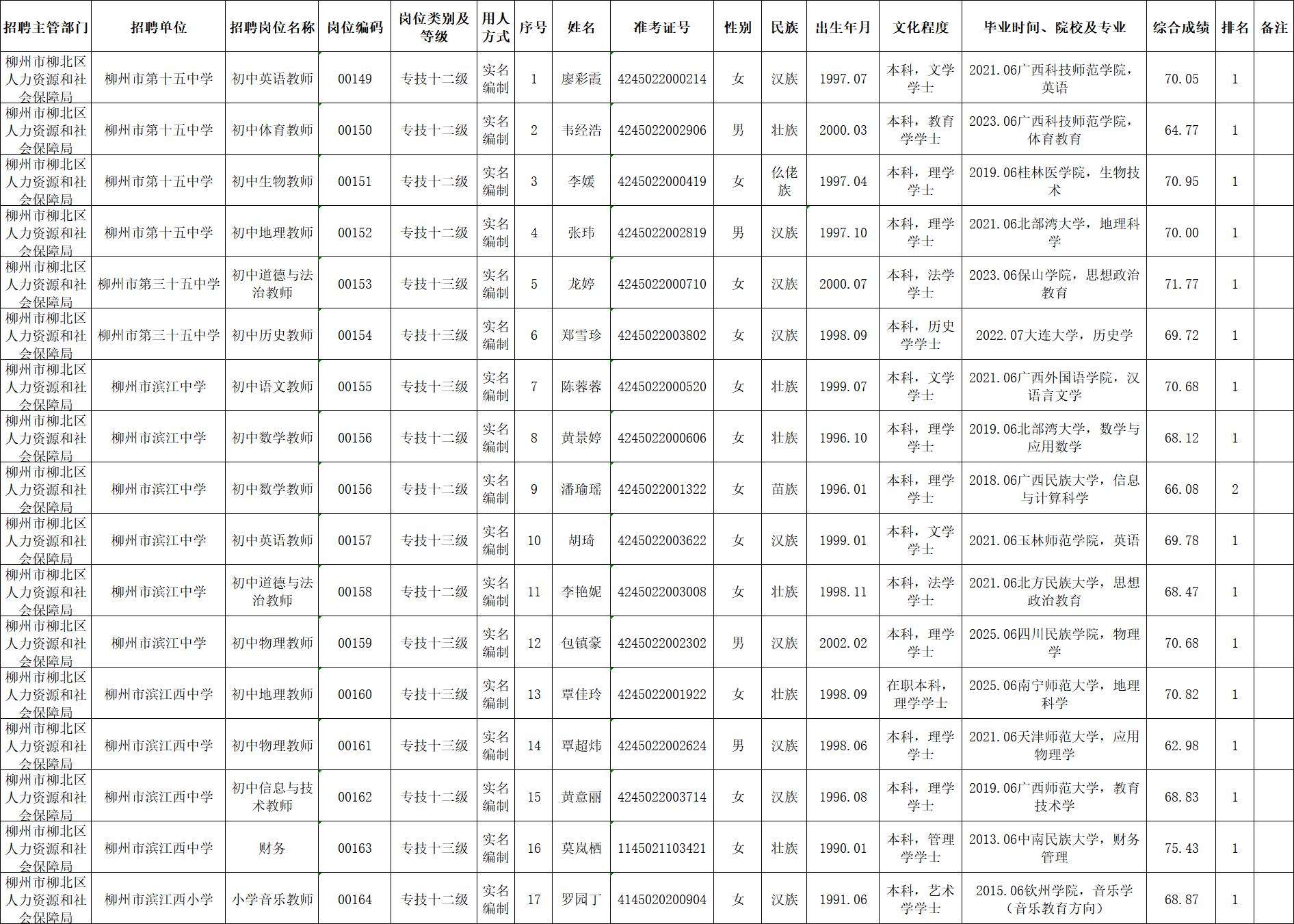 柳北區2025年度下半年事業單位公開考試招聘工作人員擬聘用人選公示(第四批)