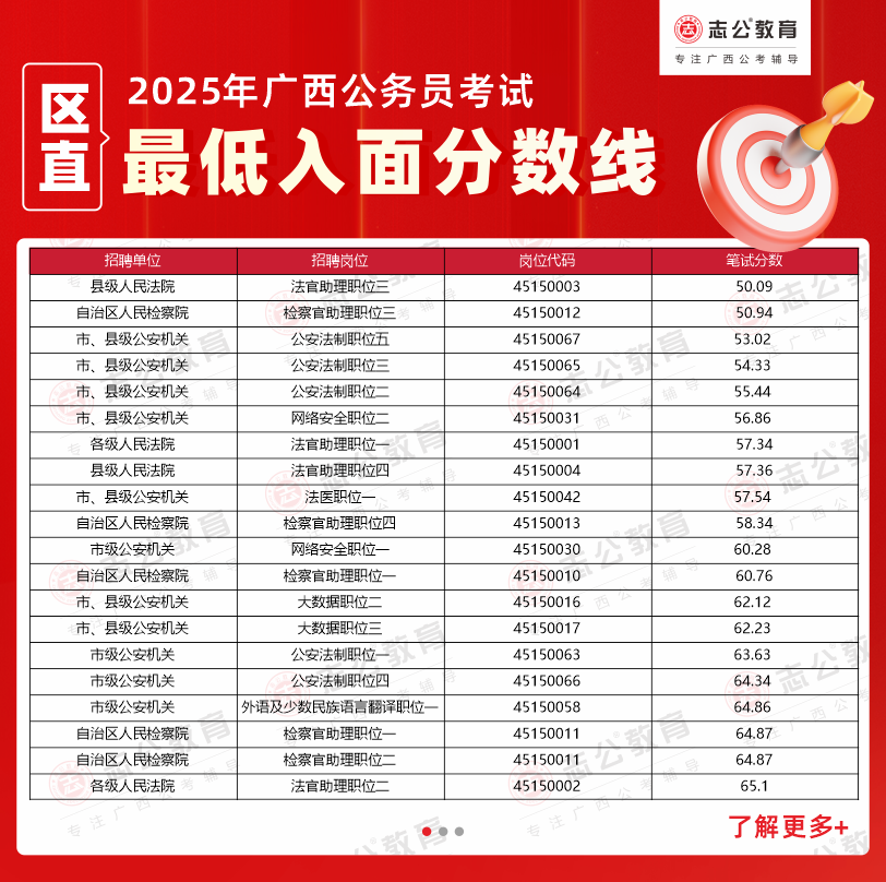 2025年廣西公務員考試筆試成績及面試入圍名單已公布。為幫助考生了解各單位招錄情況,本文根據官方發布的面試資格審查公告,整理了部分區直單位的進面分數數據,供廣大考生在備考過程中進行參考。