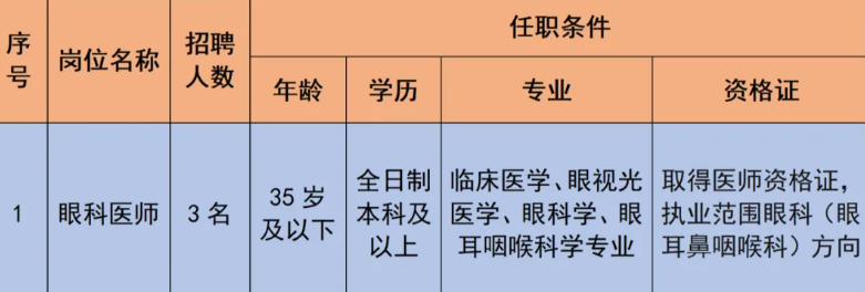 根據(jù)科室業(yè)務發(fā)展需要,面向社會公開招聘眼科醫(yī)師3名,具體崗位要求如下: