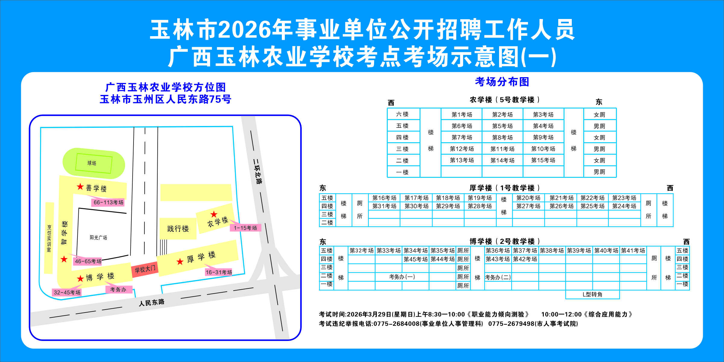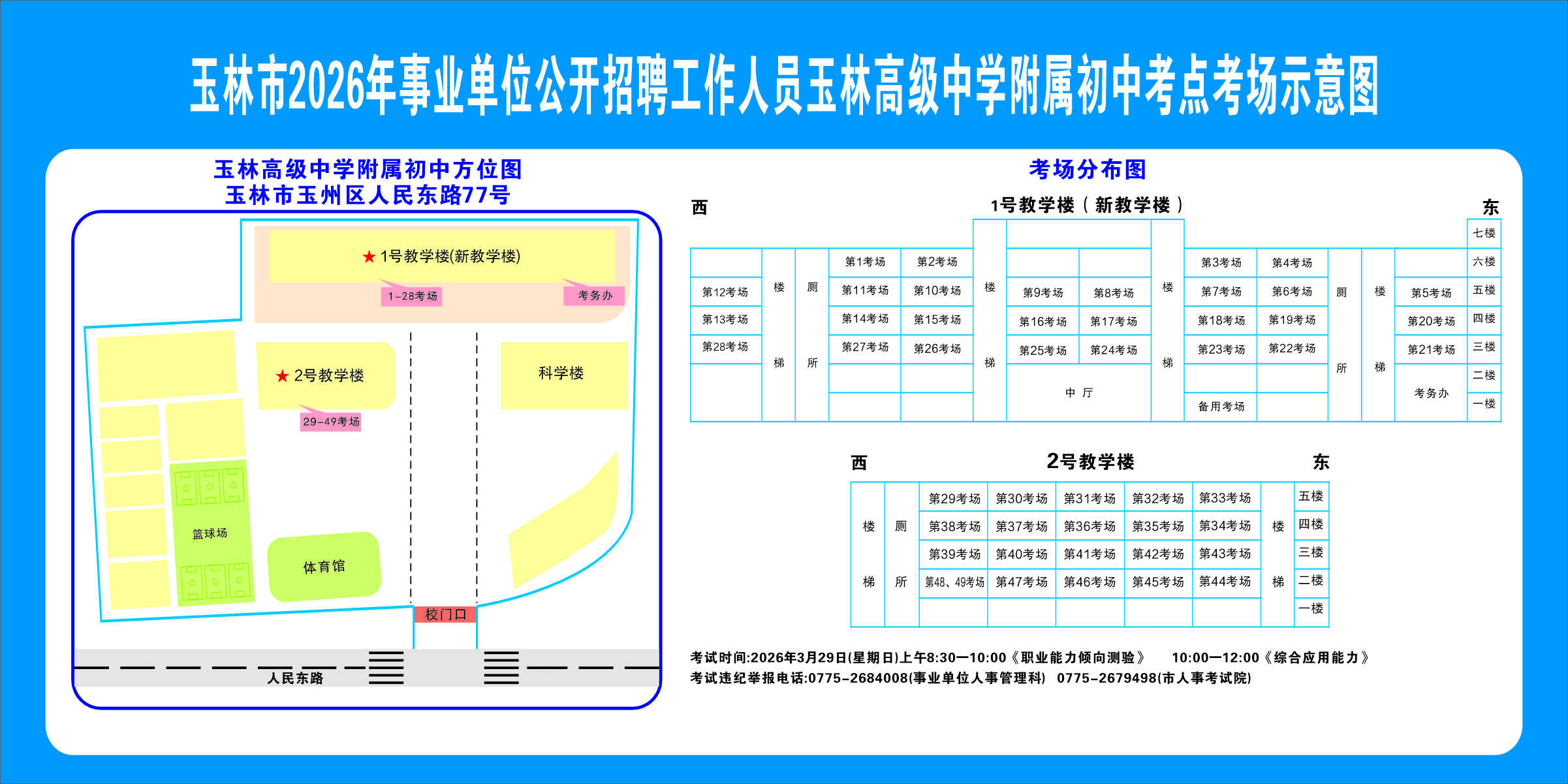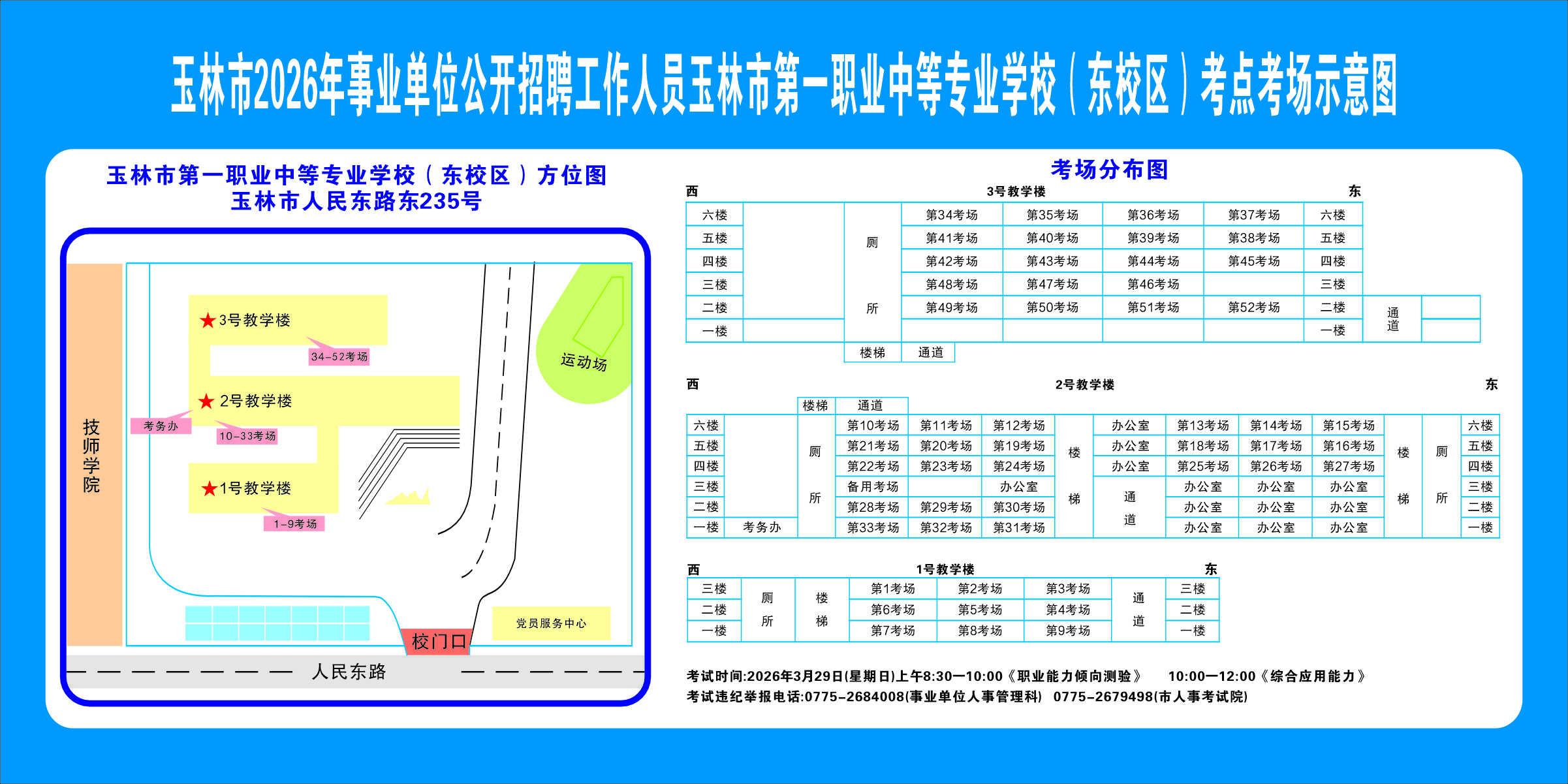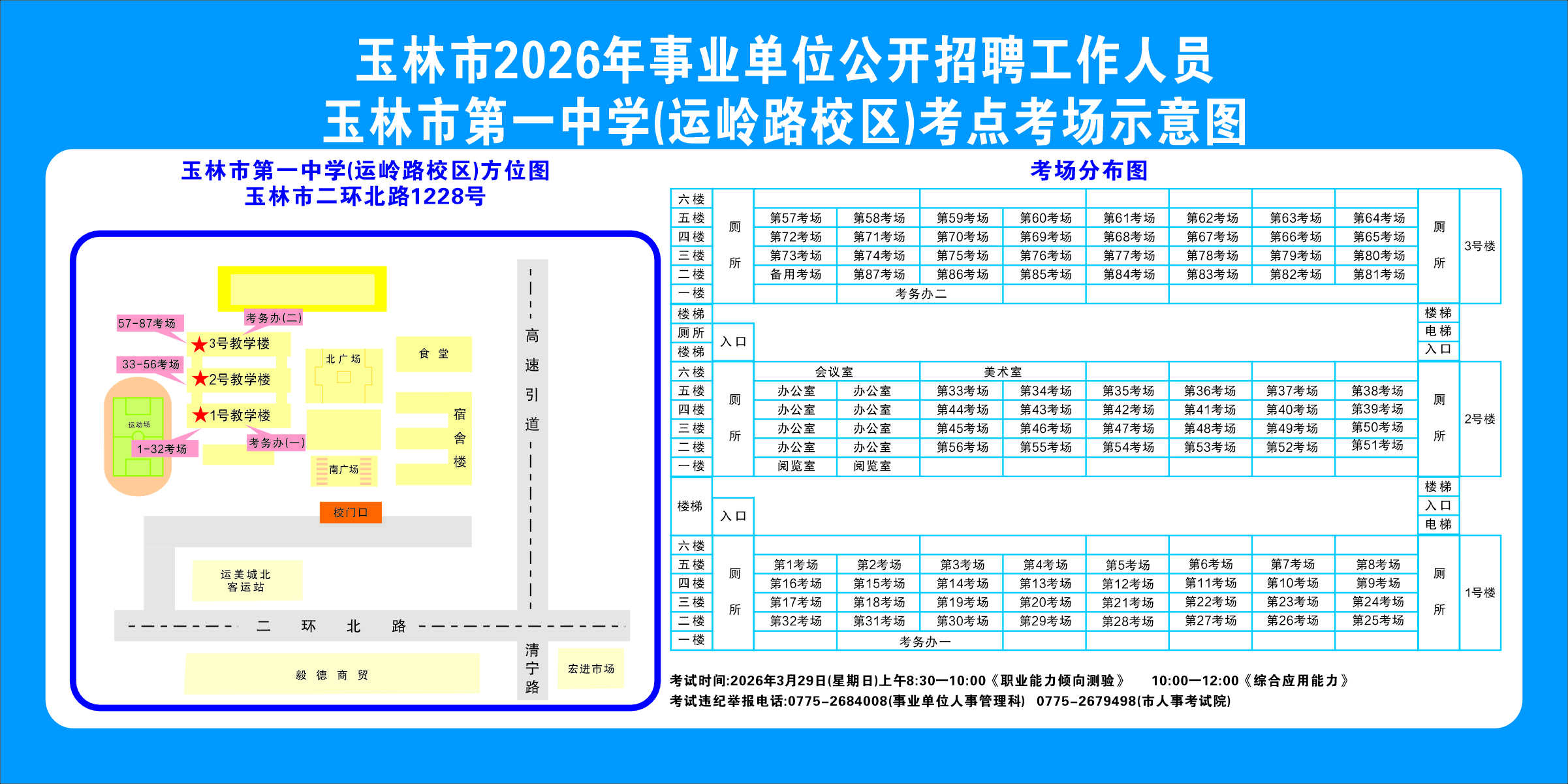 2.需要特別注意的是:玉林市第一職業中等專業學校考點是設在該校的東校區(人民東路東235號);玉林市第一中學考點分為運嶺路校區(二環北路1228號)、大北路校區(大北路453號)。