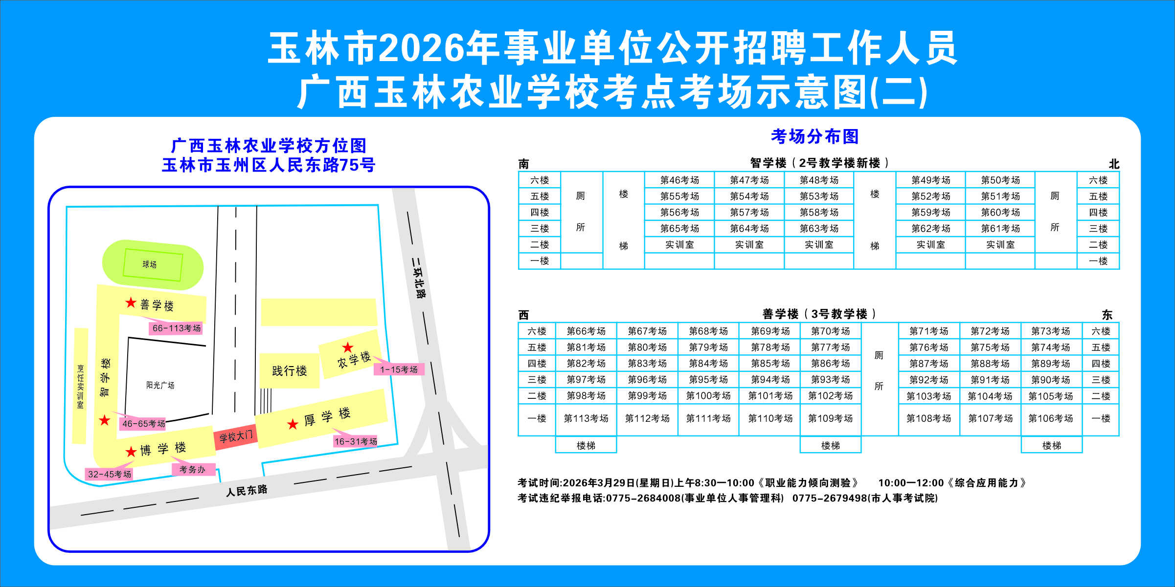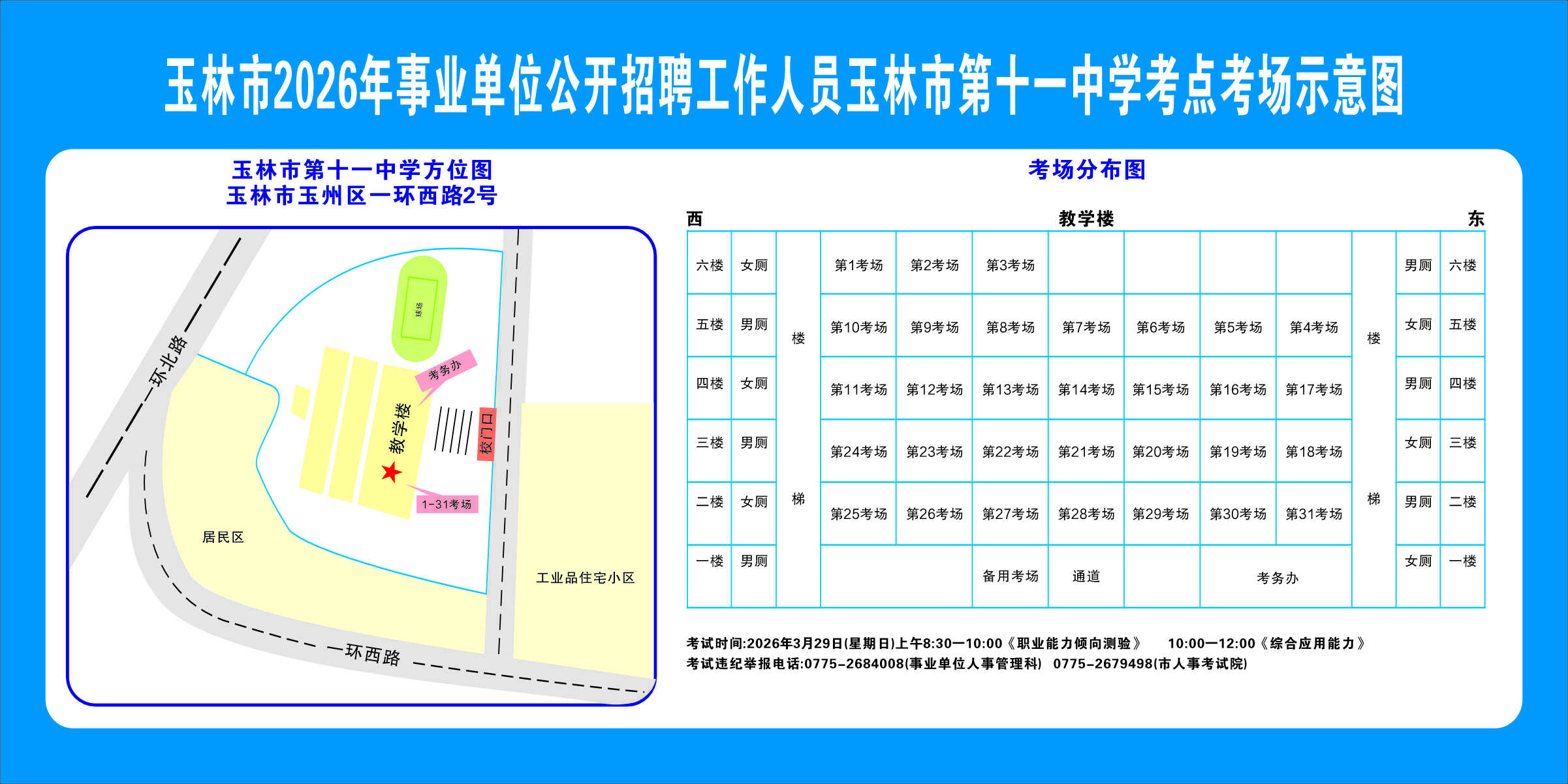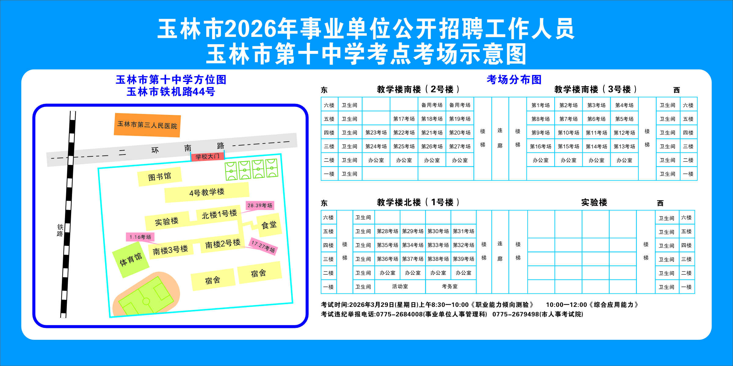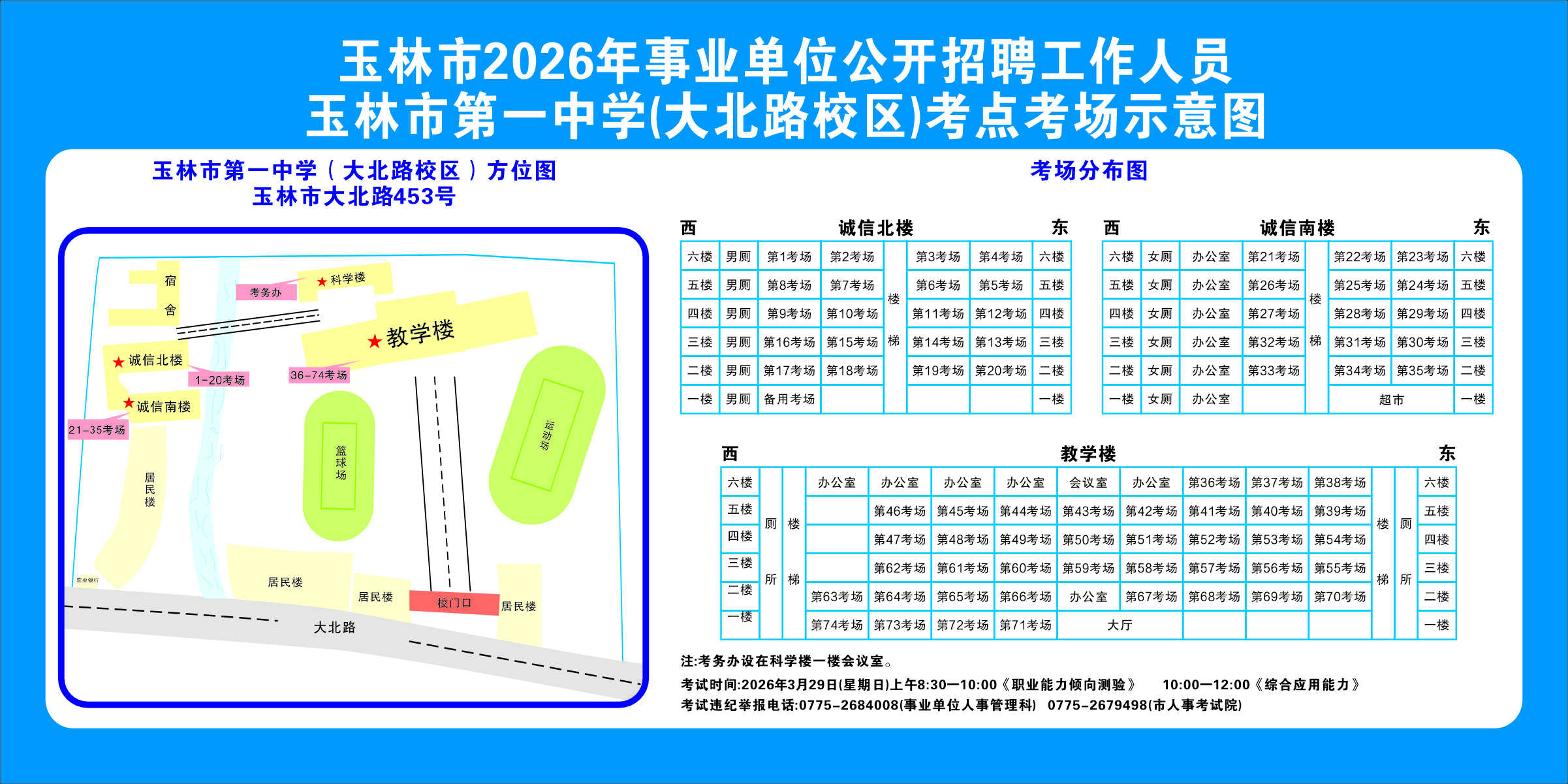 2.需要特別注意的是:玉林市第一職業中等專業學校考點是設在該校的東校區(人民東路東235號);玉林市第一中學考點分為運嶺路校區(二環北路1228號)、大北路校區(大北路453號)。