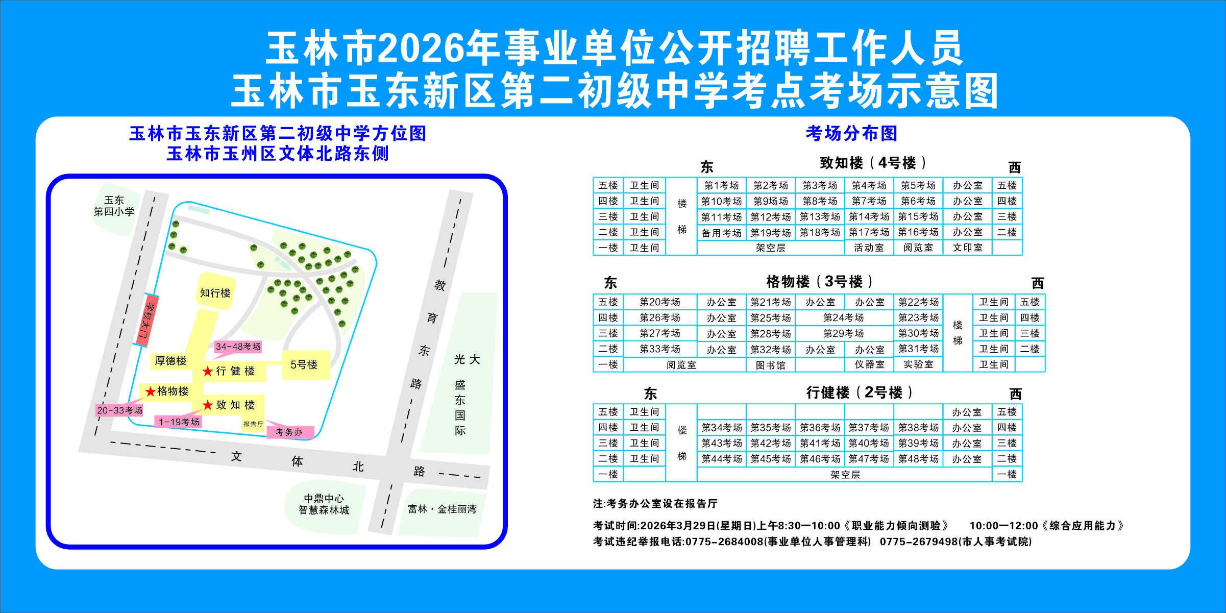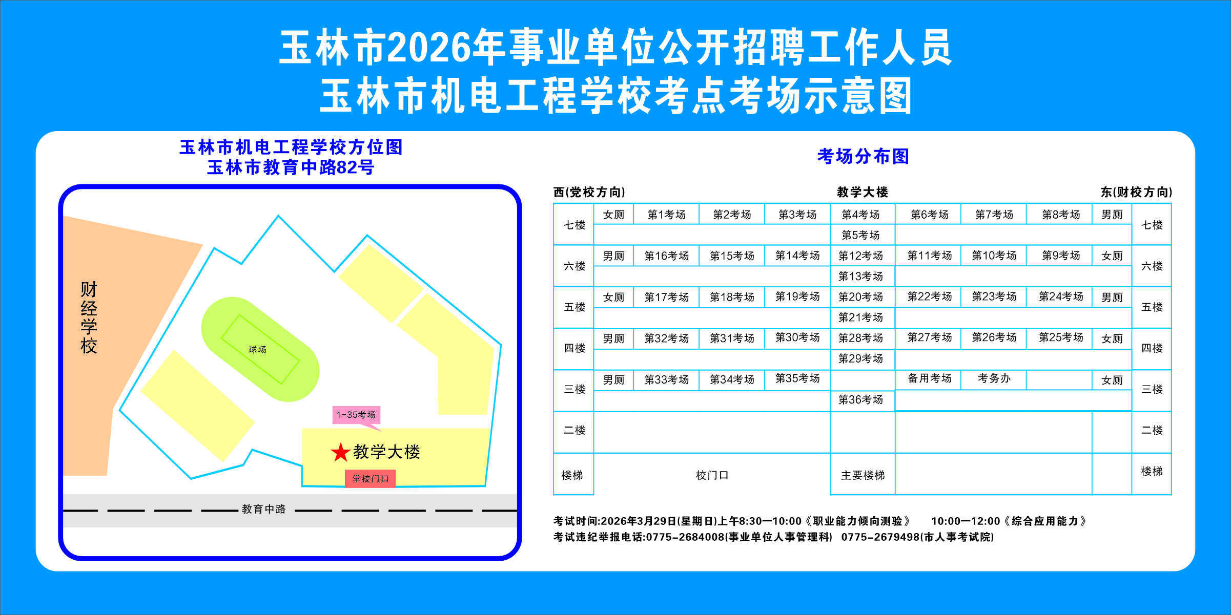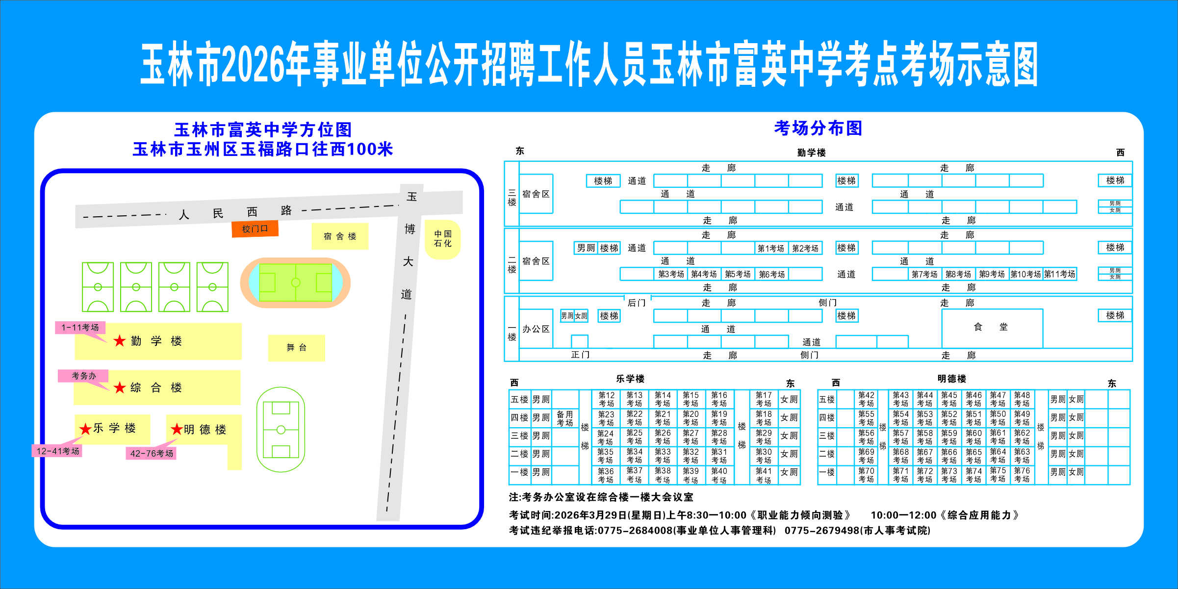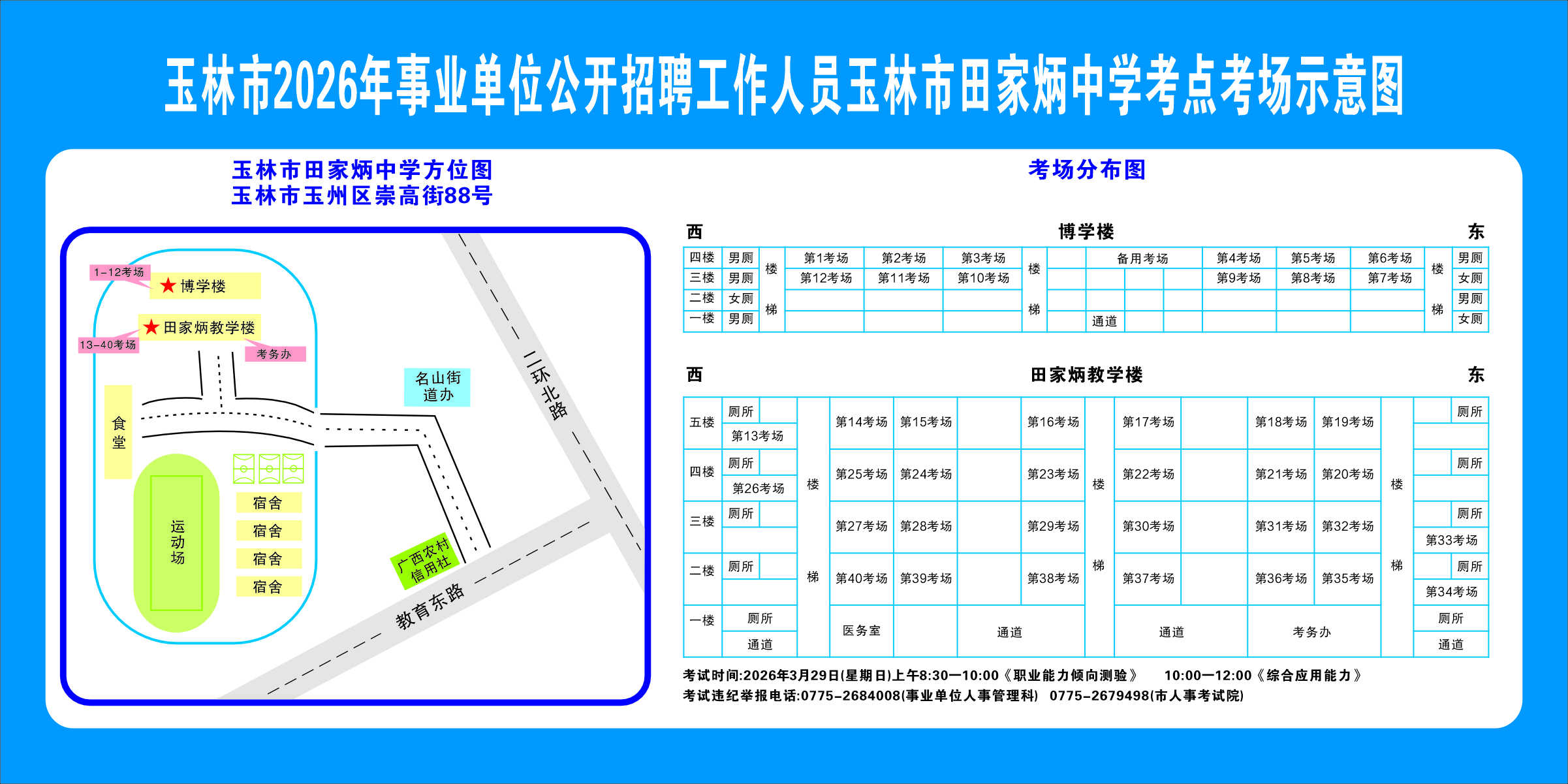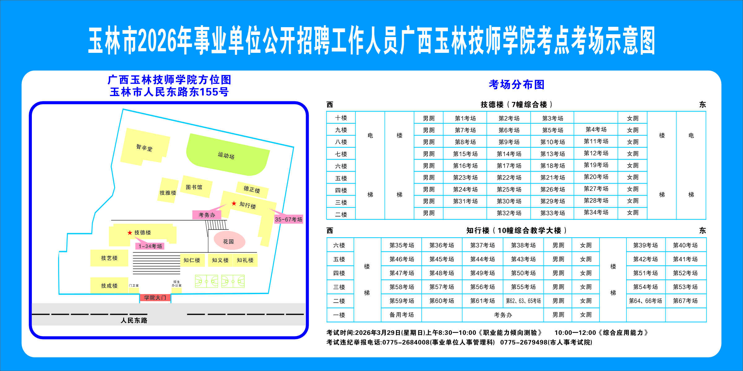 2.需要特別注意的是:玉林市第一職業中等專業學校考點是設在該校的東校區(人民東路東235號);玉林市第一中學考點分為運嶺路校區(二環北路1228號)、大北路校區(大北路453號)。