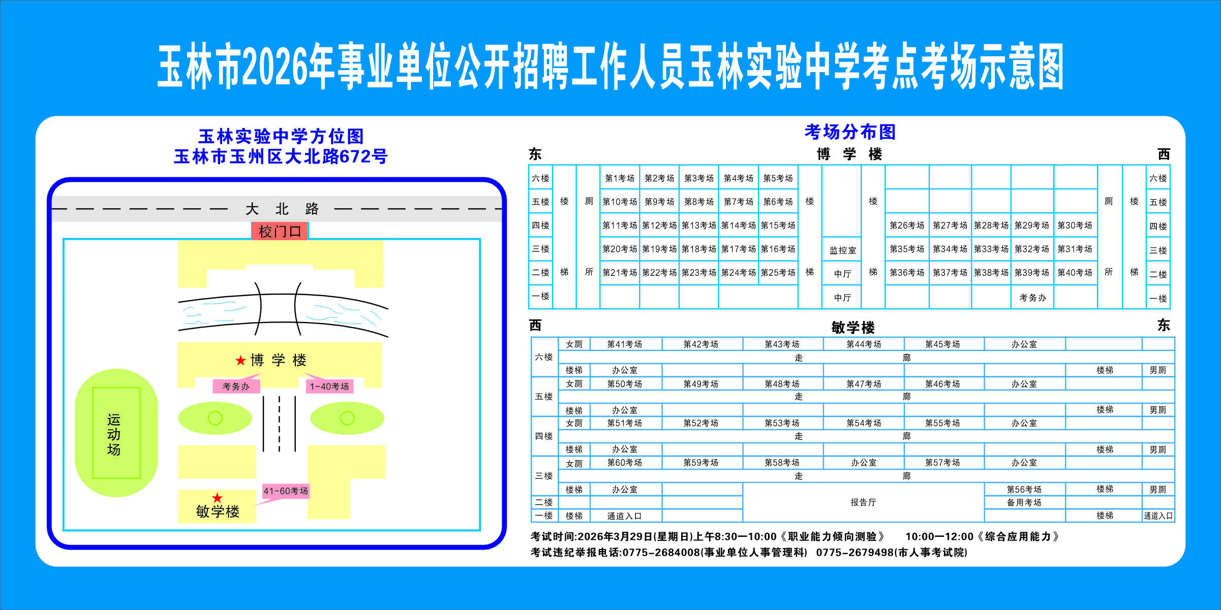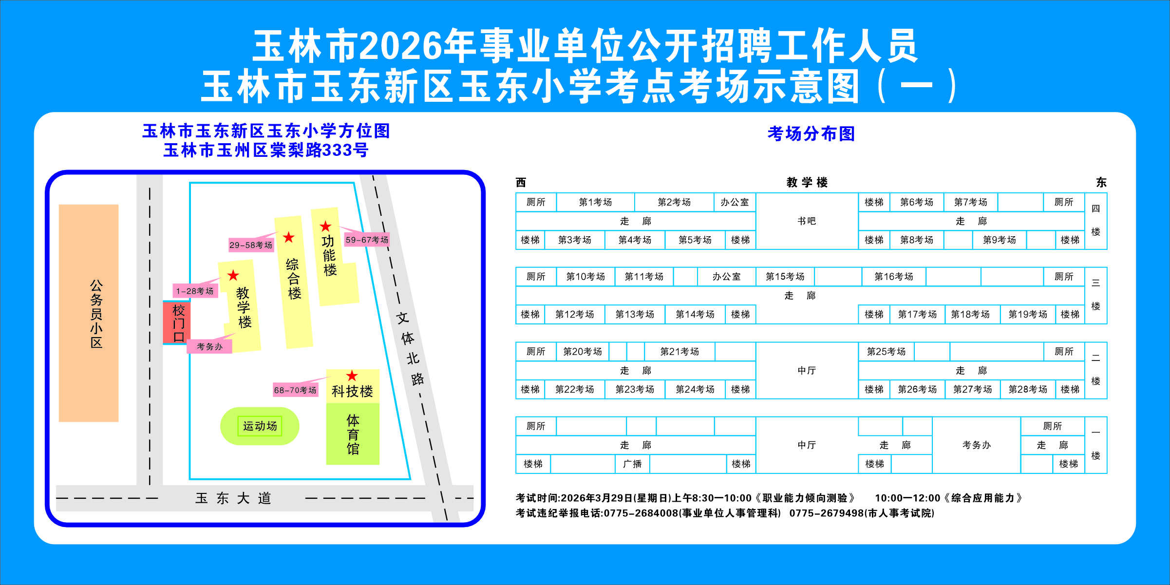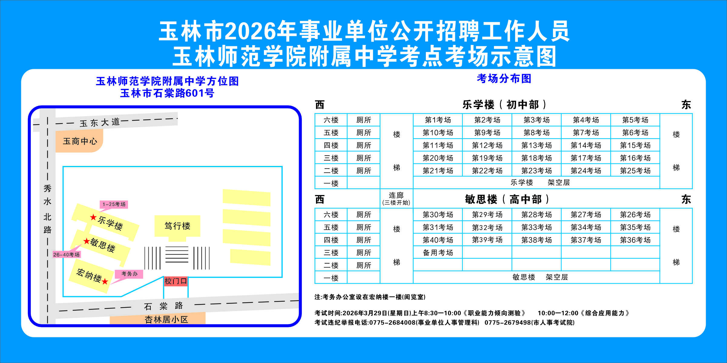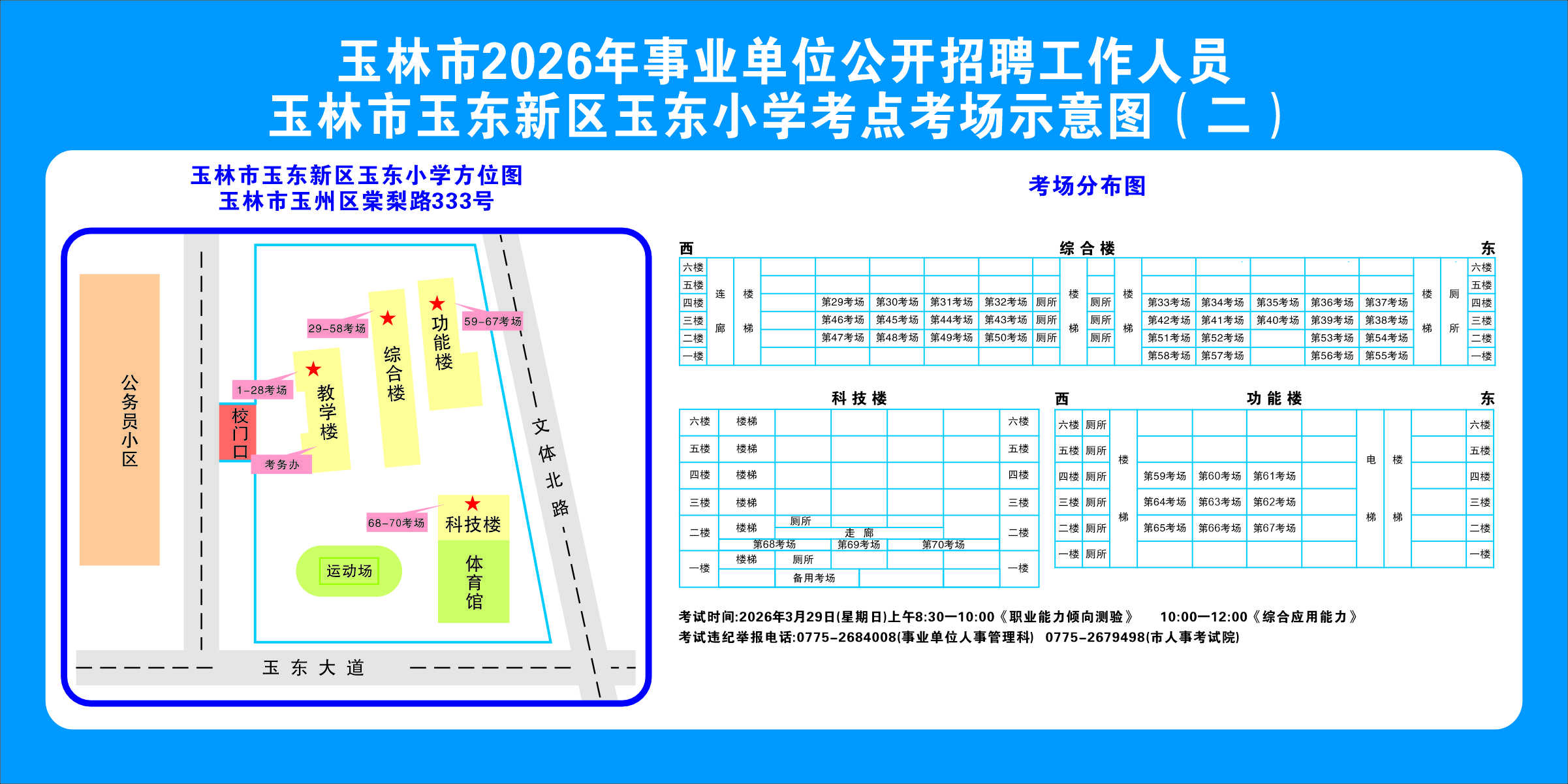 2.需要特別注意的是:玉林市第一職業中等專業學校考點是設在該校的東校區(人民東路東235號);玉林市第一中學考點分為運嶺路校區(二環北路1228號)、大北路校區(大北路453號)。