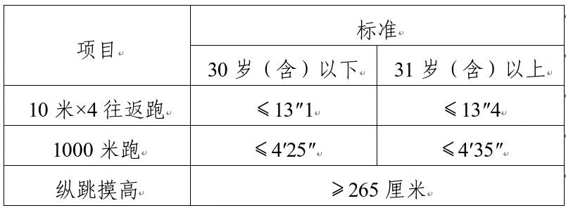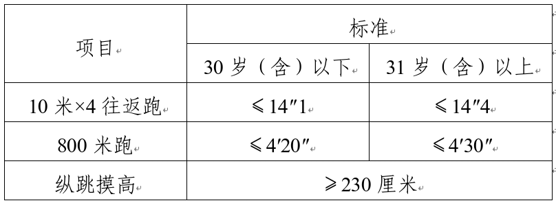 綜合管理類、執法勤務類職位測查全部三個項目,三項全部達標方為合格;警務技術類職位免予測查1000米(男)/800米(女)跑項目,其他兩項全部達標方為合格;報考外語及少數民族語言翻譯緊缺職位的人員,體能測評三項中有兩項達標的,視為合格。